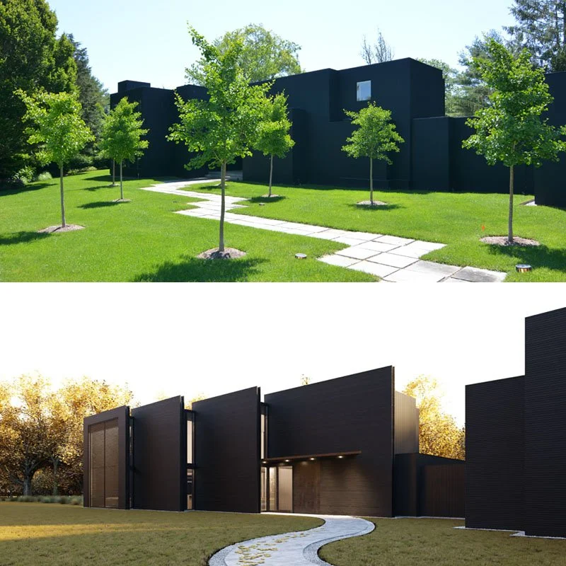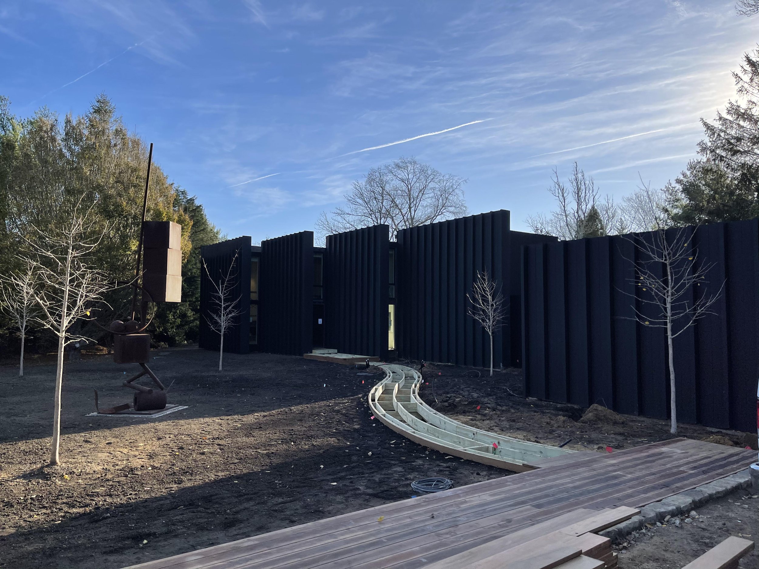 Construction site featuring a curved wooden pathway, a modern black building with textured walls, small trees, and a sculpture in a natural landscape under a blue sky with wispy clouds.