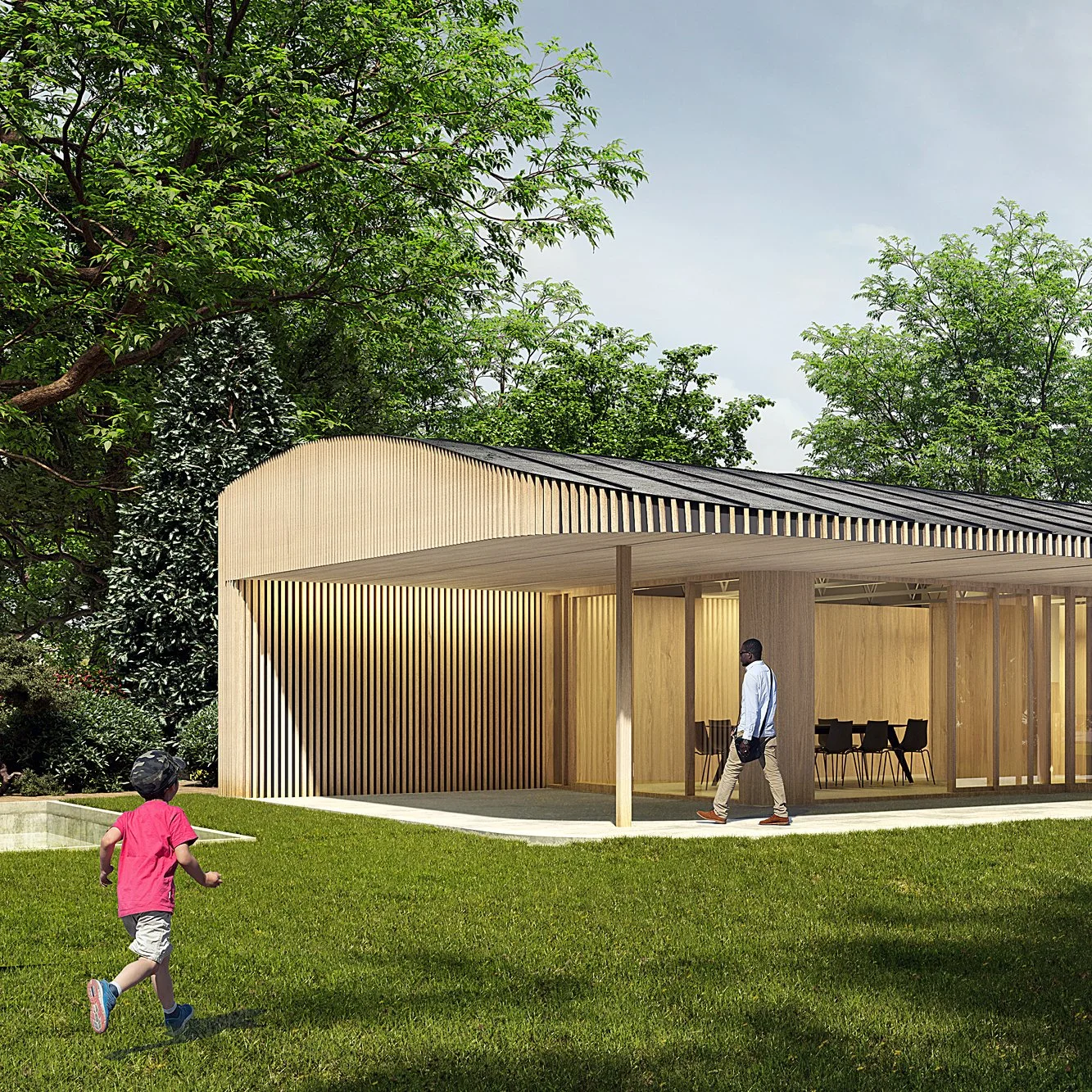 From the exterior, a large, leaf-like, biophilic roof predominates as one approaches the building. Like a leaf’s drip-tip, an elegant scupper guides rainwater to a shallow pool, celebrating simple natural processes rather than concealing them.