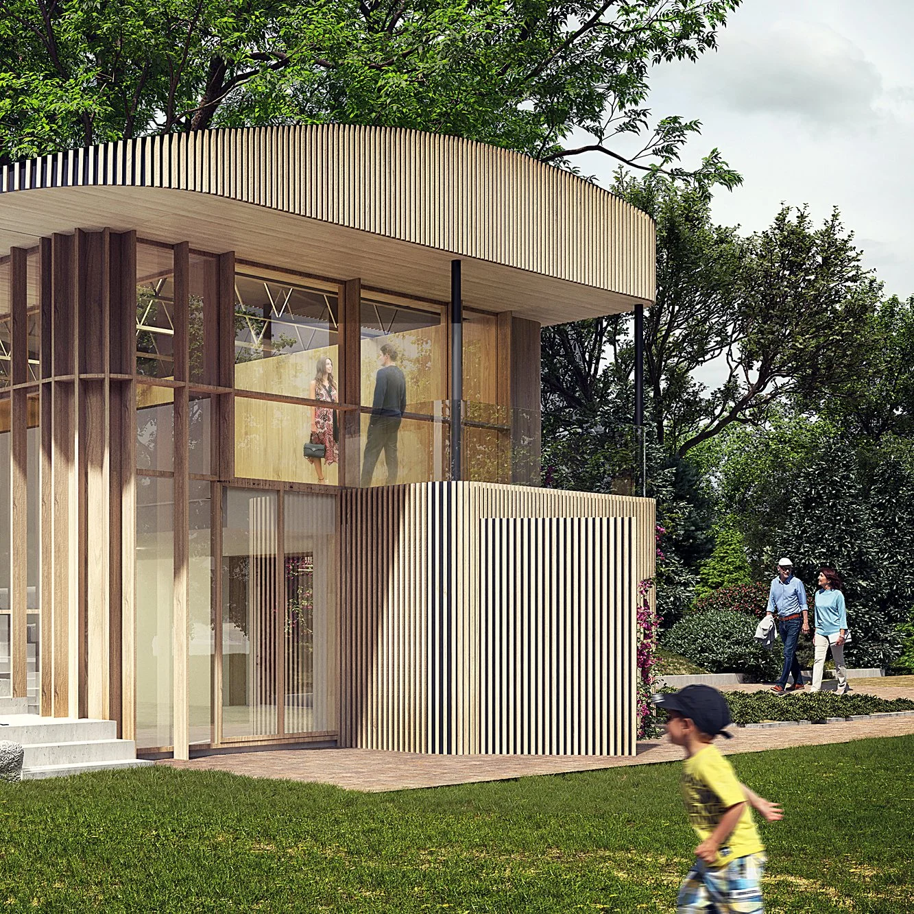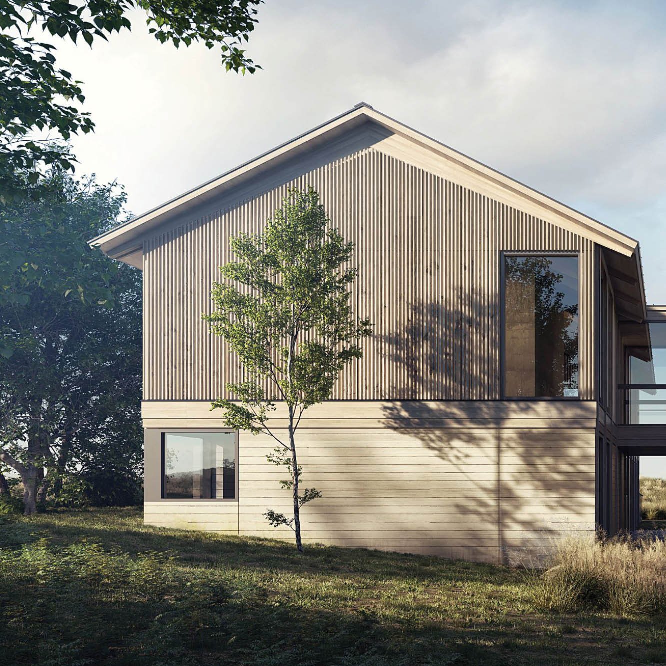 Vertical wood planks wrap from the siding to the roof, which simplifies the existing shell.