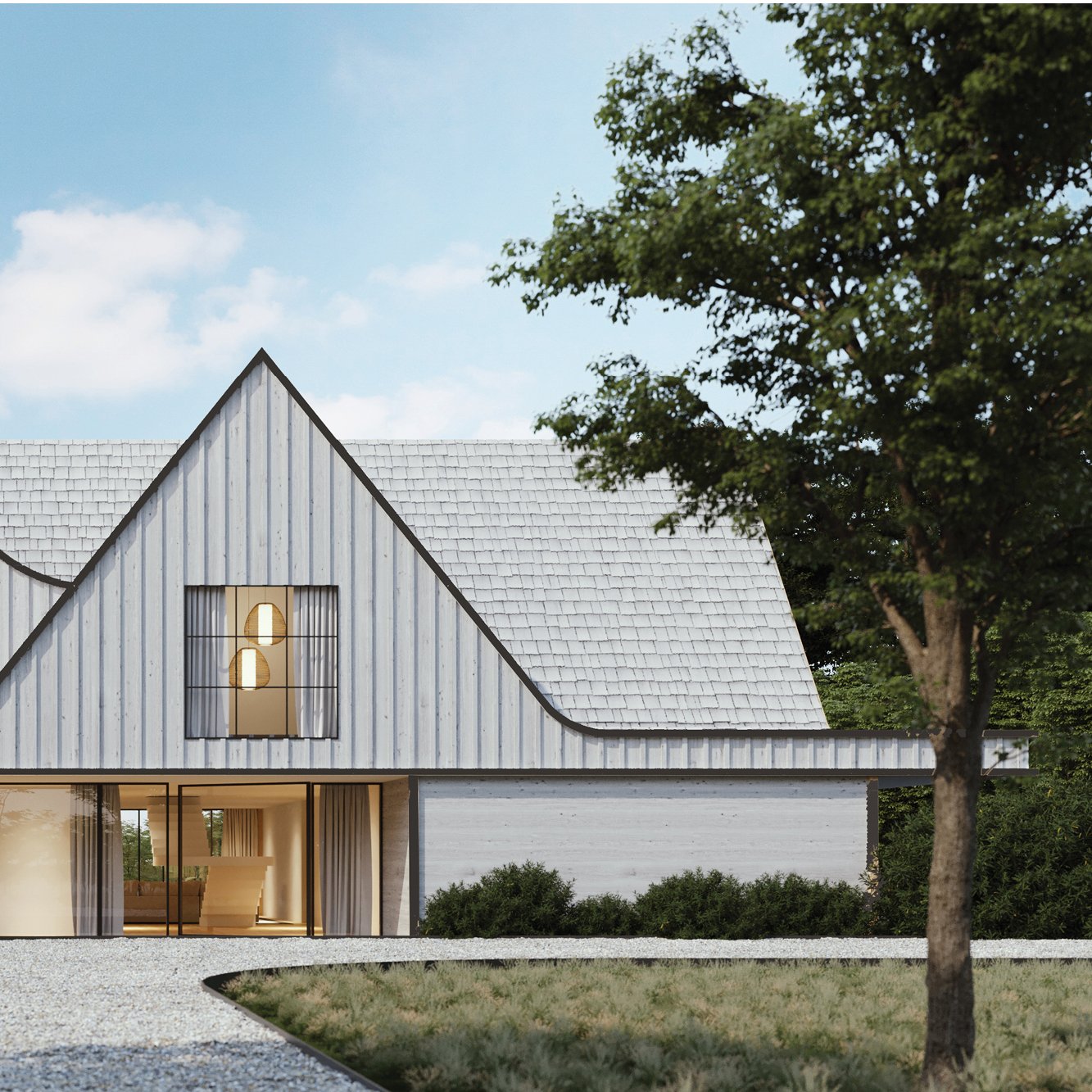 Sited along Gardiners Bay, this beach house preserves the tall, expansive windows from our original concept, framing open views of the water and filling the interiors with natural light. A glass sky bridge connects the two main volumes, offering glimpses of the bay as one moves between them. The layout separates public and private spaces, allowing the master suite to function as a quiet retreat overlooking the shoreline. Varied materials and alternating wood siding define the exterior, adding warmth and subtle dimension to the home’s coastal form.